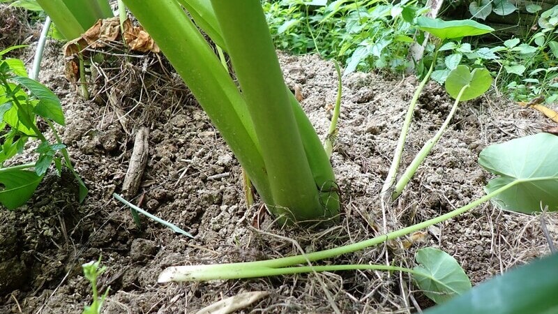 通常であればサトイモの株間は50cmですが、コンパニオンプランツのショウガと栽培する場合は約80〜100cm開け、間にショウガを植えます。