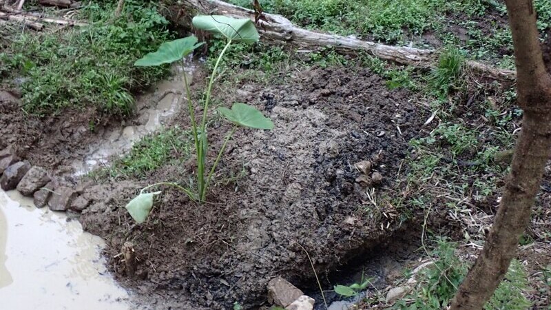 レンコン予定地場所より、じわじわと水が湧き出ている。この水が、サトイモの畝に吸収されていくため対策としてレンコン池を作ることになった。土手も作ることで、水が流れ出るのを止めることが出来る。