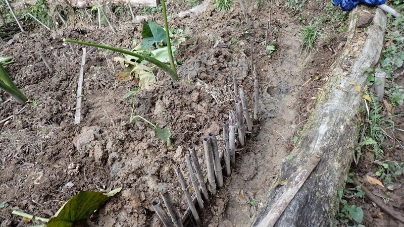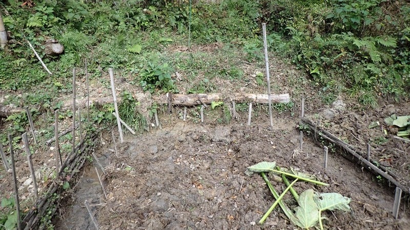 サトイモ畝も土が崩れないように、竹でしっかり囲いたいな。