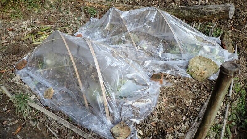 4株ほど掘り起こさず残したものに、霜対策で今年はビニールをかけてみることにした。
