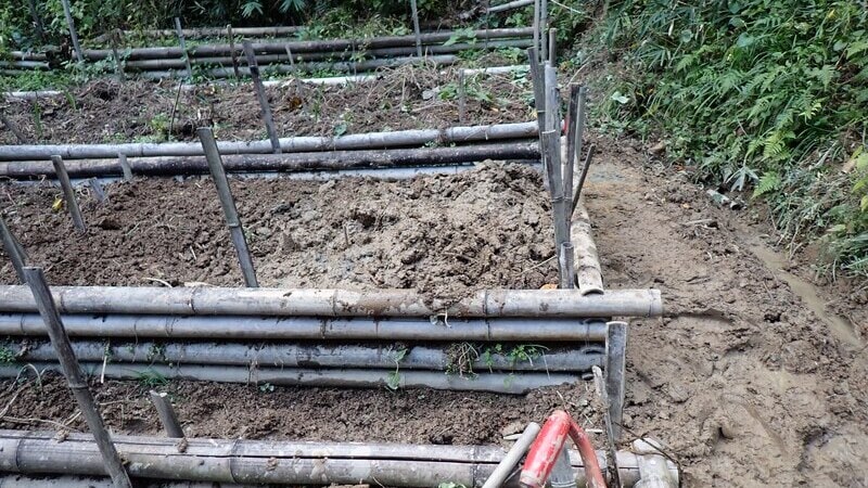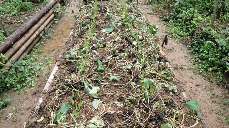 イノシシさんが周りの土を削り落としてくれたおかげで、畝に戻す土の量が増えたのと、改めて溝をしっかり掘ることが出来ました。