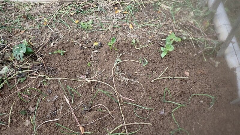 なんとか通路や隣の畝まで飛んできてたソラ豆と玉ねぎの苗を回収することができ、植木鉢に緊急避難させることができて一安心です。