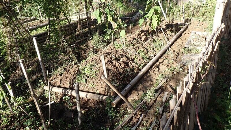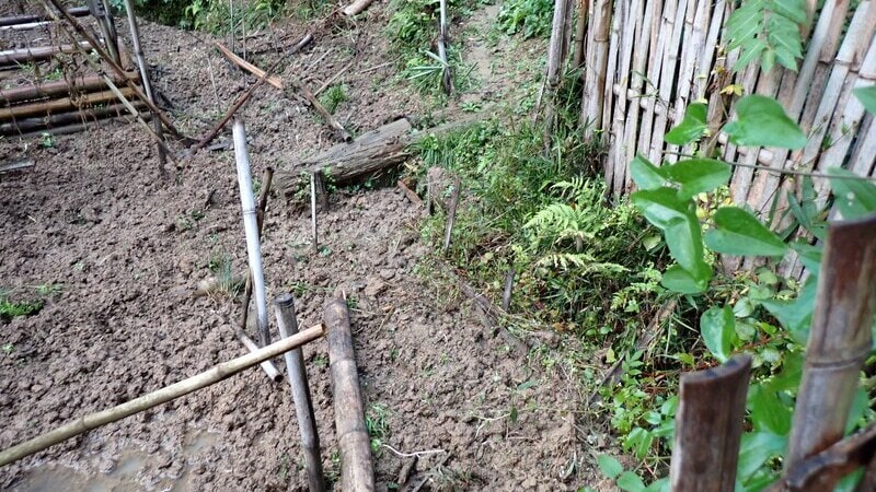 畑の囲いを破壊することなく、2回侵入してきています。里芋畝の奥の方向で一部竹を伐採した時に倒れた竹で囲いが一部壊れてしまった箇所があり、そこから入ってきているのかもです。