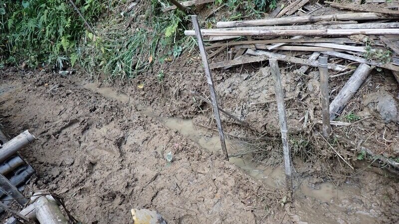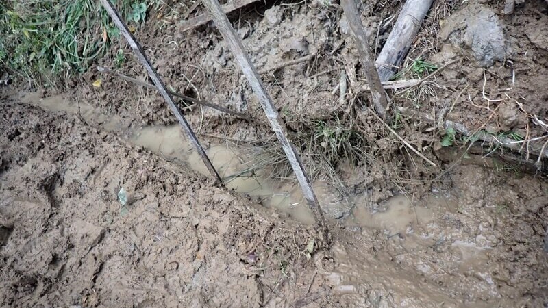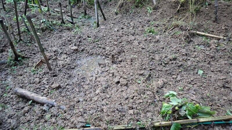 少しずつ、土を掘り起こしていくと、じわっと水が出てきて、竹の暗渠に向かって流れ出しました。溝と地面の高低差が出たことで、雨降り後に浸水してくるリスクが減り、グチョグチョしていた地面が乾いていきそうな気配が見えてきて嬉しい誤算です。