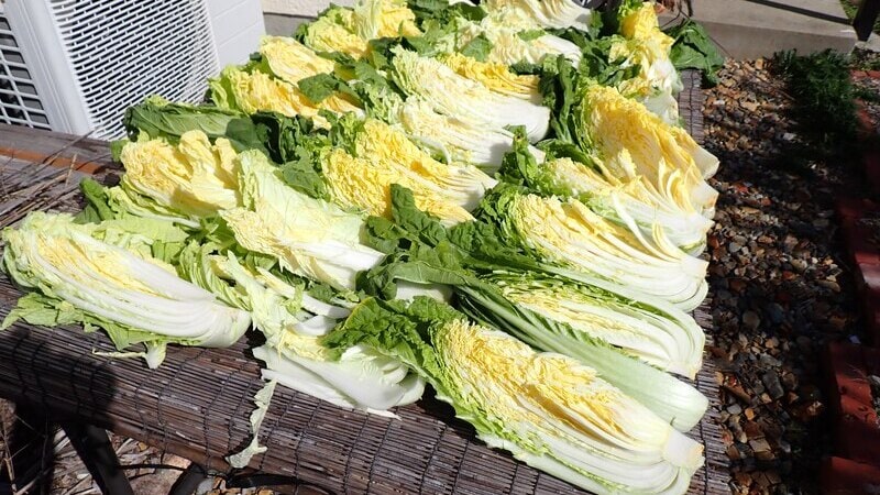 一玉1kgの白菜20個を四分の一サイズにカットして並べ、半日干しました。