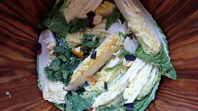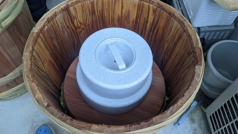 麹の匂いもしてきて、順調じゃないかな。一つの樽に白菜をまとめちゃおう!もう一つの樽は新たに大根でタクアン作りたいよね!