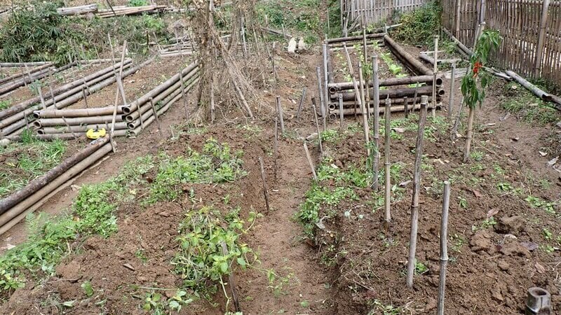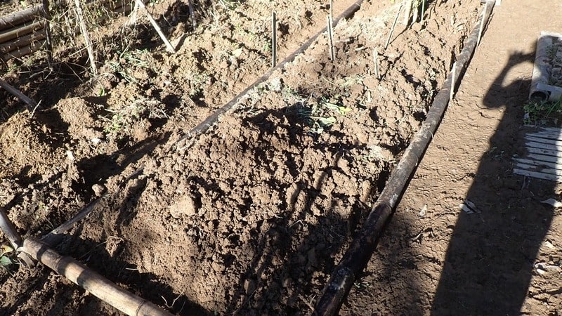 トマト畝もナス畝と同様に整えて、竹の囲いをセットできる準備をしていきます。