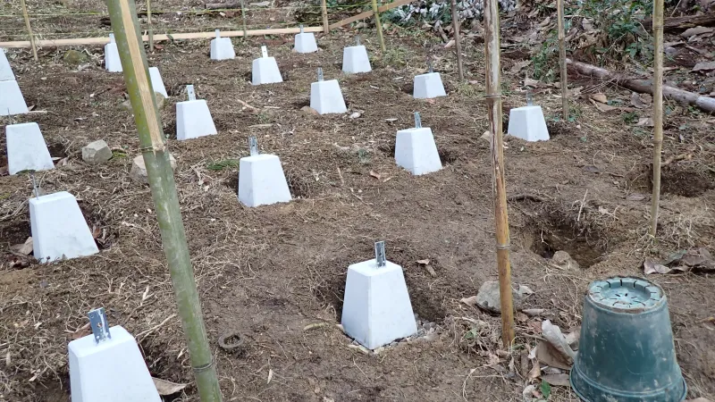 私がせっせと野菜のお世話に勤しんでいる傍らで、旦那さんと息子は、小屋建築の基礎工事をがんばってくれていました。
