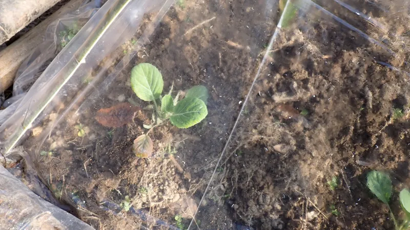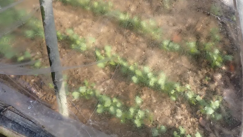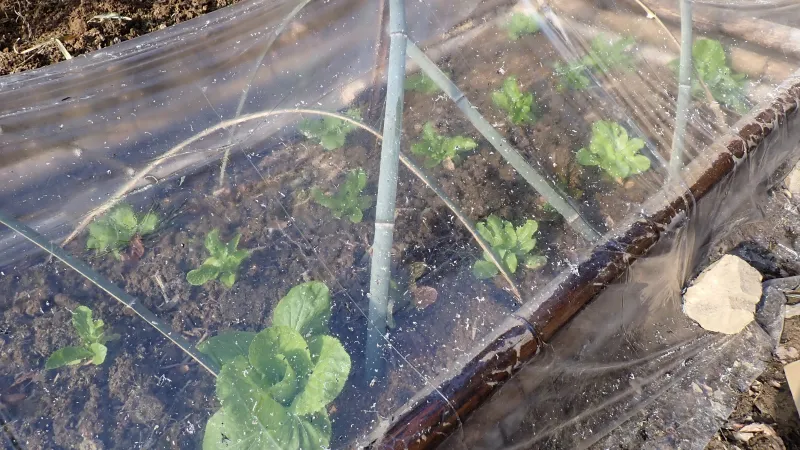 畑の様子を見に行きました。ビニールで覆われた野菜たちは、暖かく過ごせているようです。