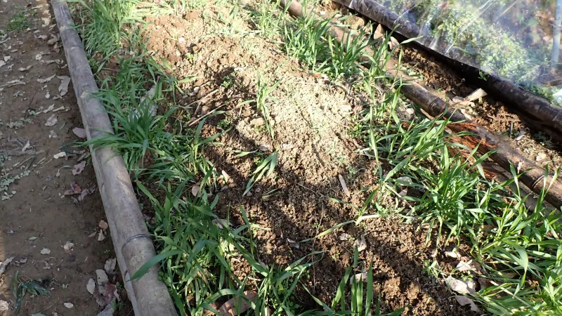 いのPiちゃんが散らかした苗を拾い集め、元の畝に移植し直した大麦はシャキンと伸びています。大麦の強さには、驚かされますね。