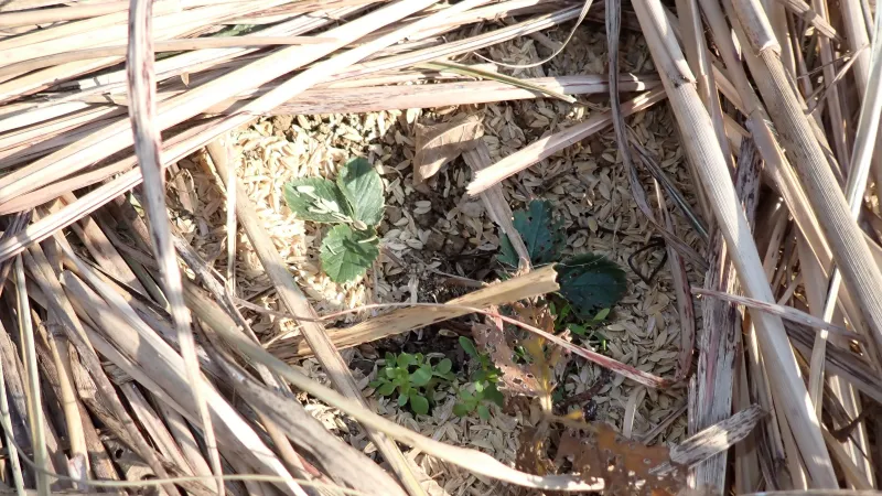 イチゴの苗を囲むように敷いたススキが温そうです。