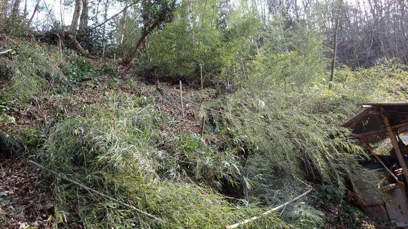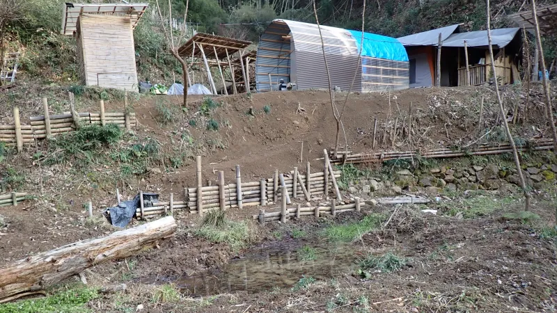 小屋の建築作業は、冬の間はお休みすることになりました。その間に気になっていたジオフィルター周辺のスロープの修繕、ひょうたん池周囲の堀り作業や道具小屋周囲の竹をカットしました。