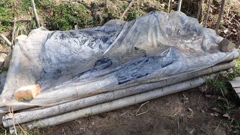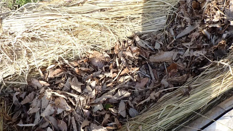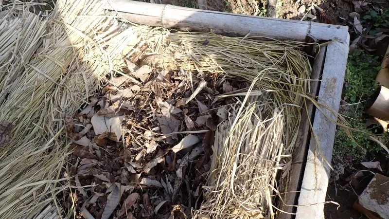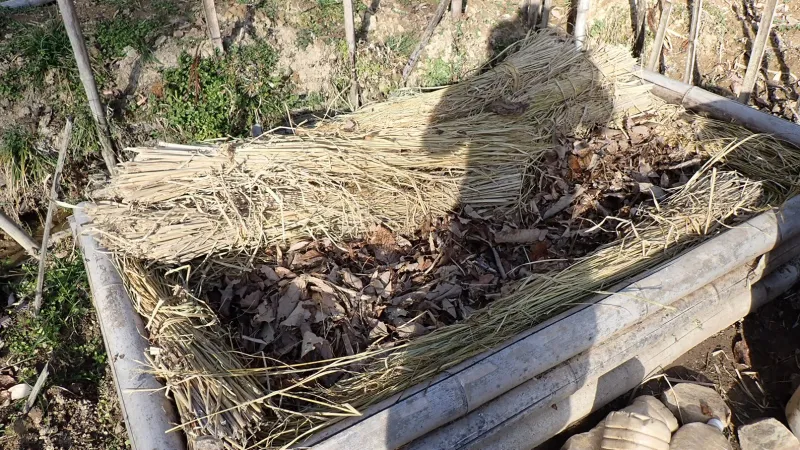 気温差がないように北側を厚めに敷きました。枯葉には水を十分に与えておきます。乾燥しているようなら、都度水を与えるようです。これにシートを被せて発酵を促し、熱が上昇するのを待つという手筈です。