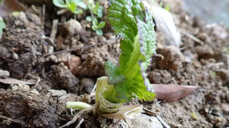 大根畝の左隣の畝で、嬉しい発見がありました。昨年の秋に直播きしたゴボウの種が発芽がして成長していました。一緒に蒔いたニンジンも所々発芽していました。
