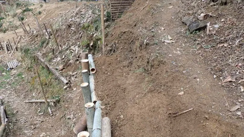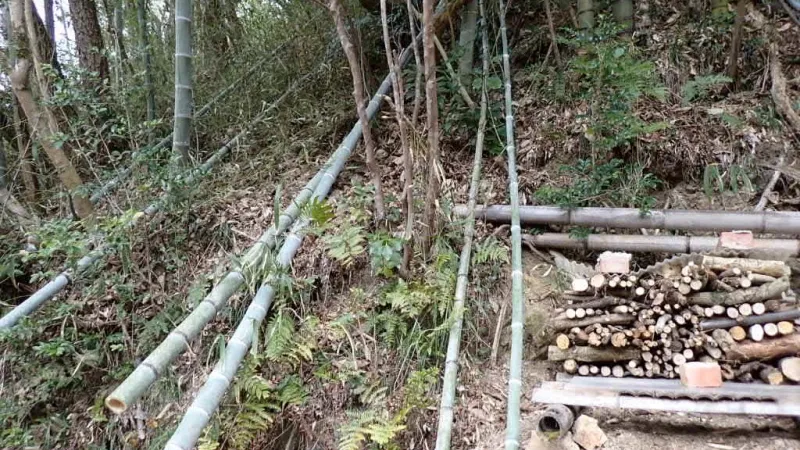 今度は穴掘り器を使って、竹筒を土中に埋めて強化し、横に並べる竹の長さも短くして、土の重みによる負担を軽減しています。