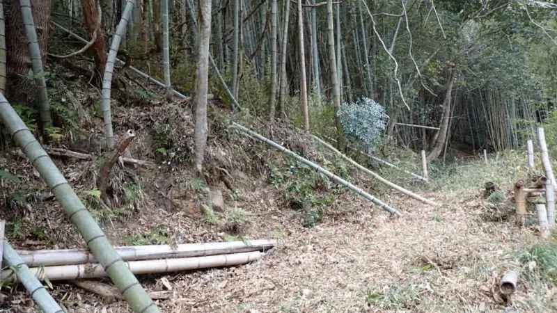 細めの竹は公道の斜面に倒して、乾燥させて処分します。切り倒して使っていくことが、公道の整備にも繋がります。日当たりも更に良くなっていきます。美味しいタケノコも収穫できるし、いいことだらけです。